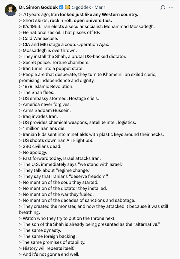 The US lured them to the negotiating table, then, without warning, murdered their leadership. This echoes last year’s 12-day war, where Israel and the US lured them in on the premise of good faith talks, then murdered them and now play the victim.